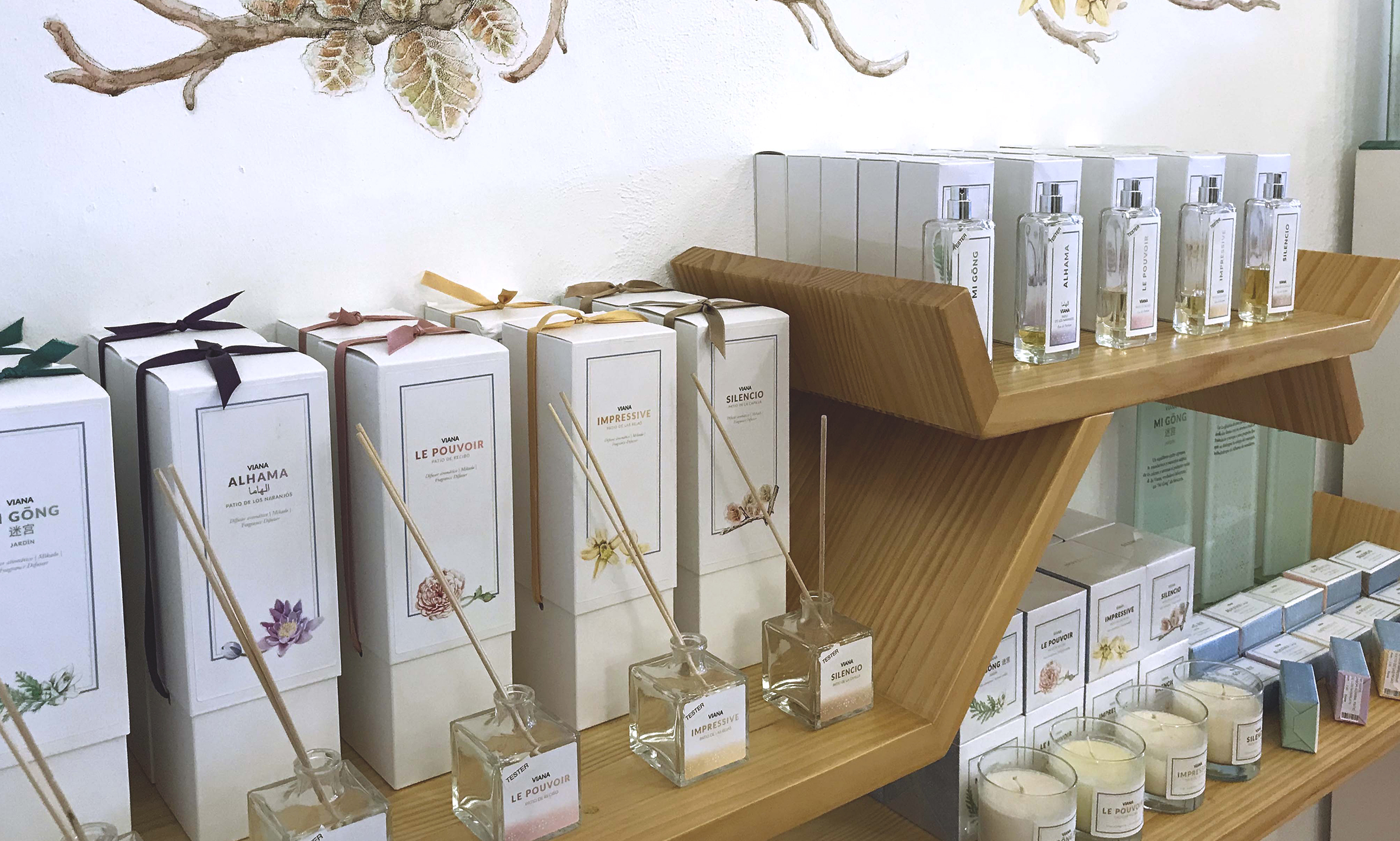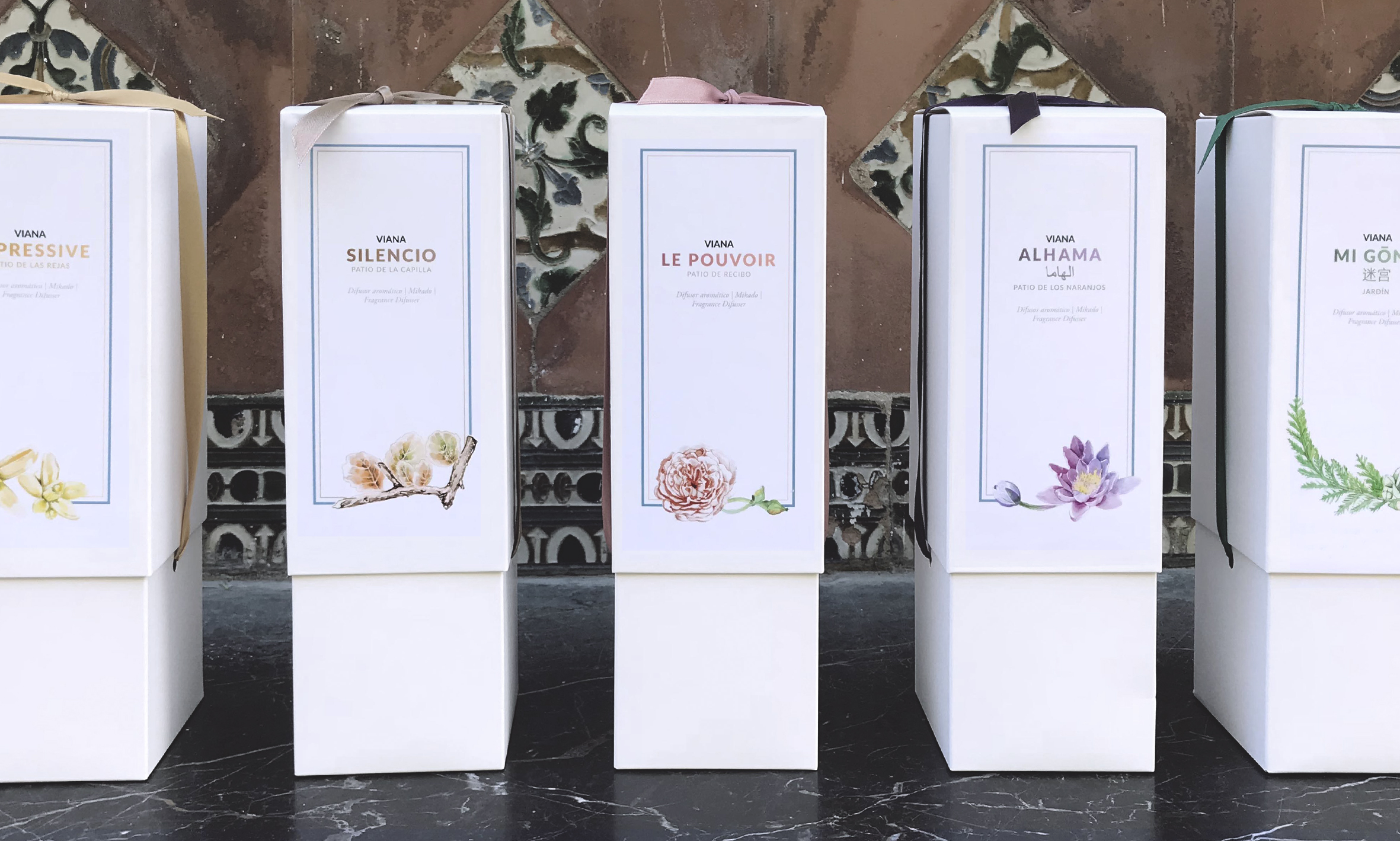 Viana, una línea de esencias que inspira elegancia, armonía, exquisitez, contemplación, prestigio, mimo, estilo, frescura y calma. Una selección de plantas que podemos encontrar en el Palacio de Viana, se mezclan para acercarnos a sus Patios.