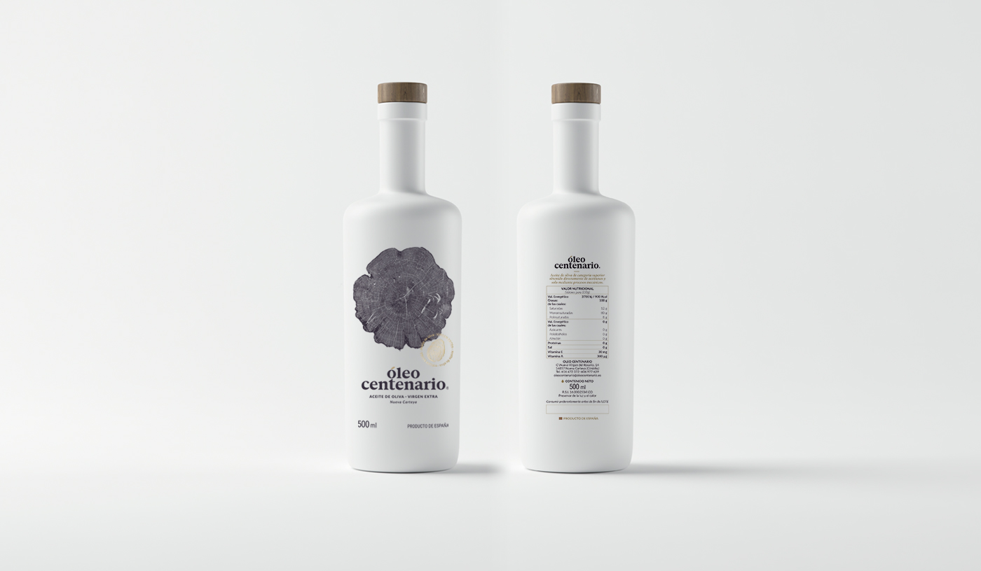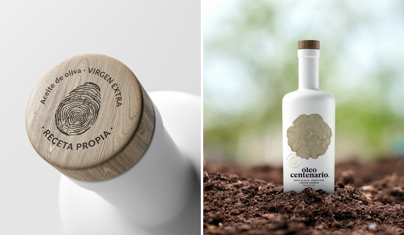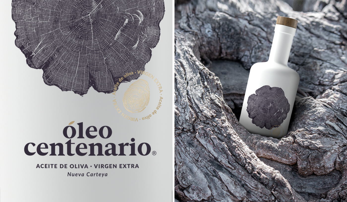 El concepto de partida para la propuesta gráfica del producto es la mezcla de los anillos del árbol, a través de los cuales se mide la edad, y la huella dactilar como valor humano y sello de calidad del producto, ya que es un aceite elaborado con la propia receta del cliente, que lo hace más personal y especial.