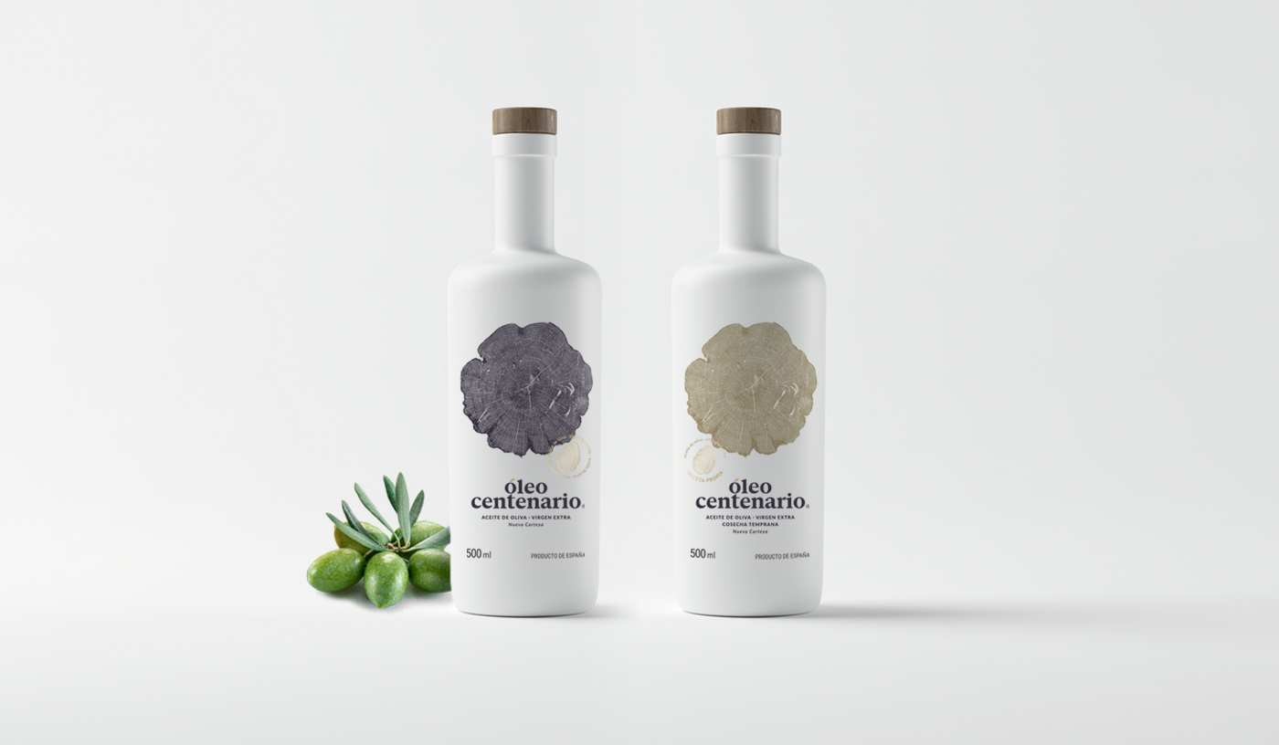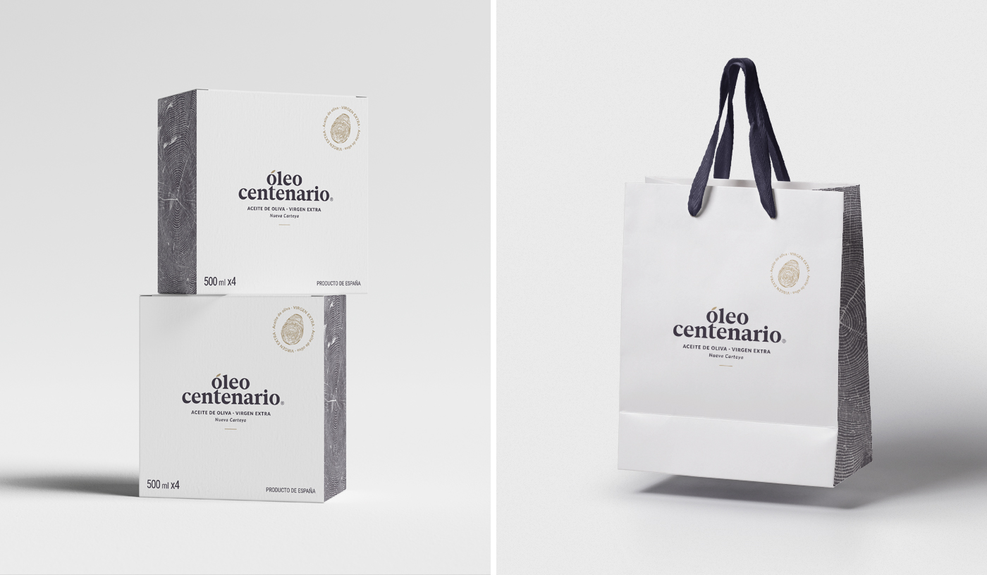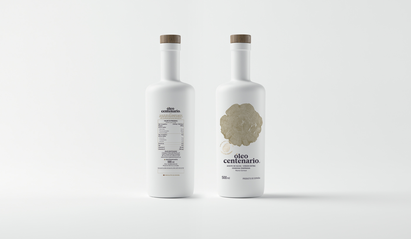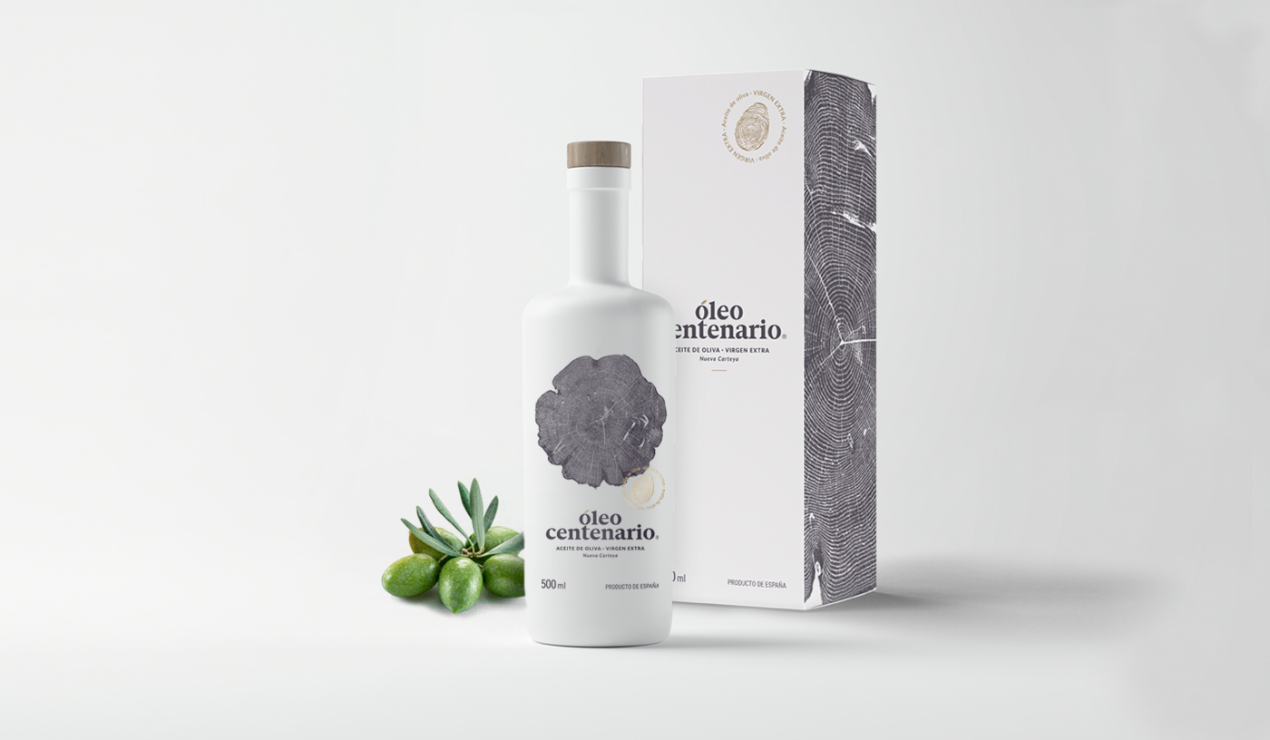 El concepto de partida para la propuesta gráfica del producto es la mezcla de los anillos del árbol, a través de los cuales se mide la edad, y la huella dactilar como valor humano y sello de calidad del producto, ya que es un aceite elaborado con la propia receta del cliente, que lo hace más personal y especial.